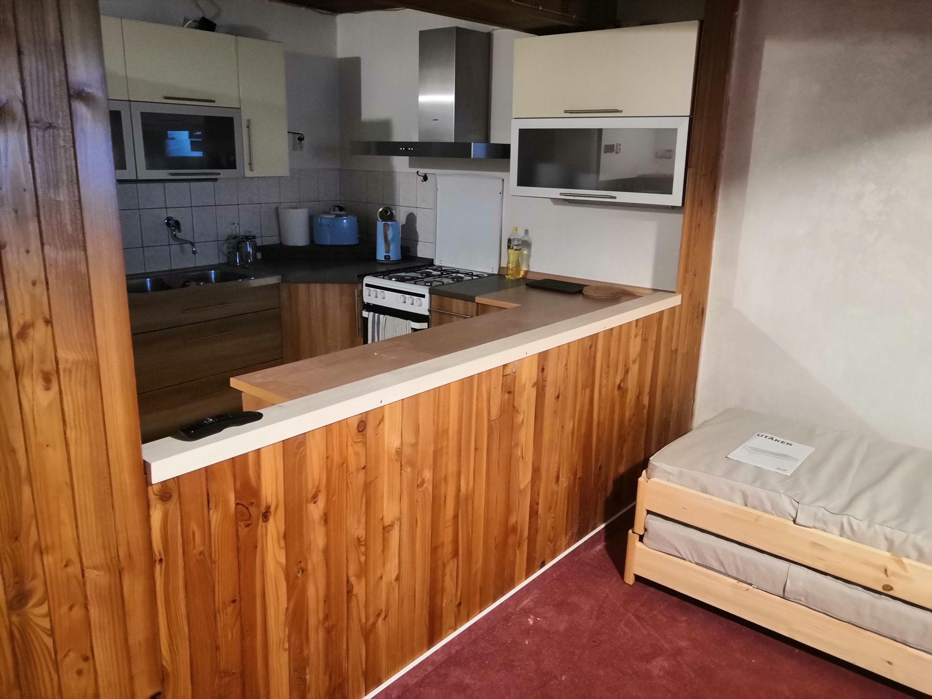 zasekávání nové elektřiny, zapojení a instalace nových zásuvek, úprava části kuchyně, instalace osvětlení, pokládka koberce, soklování, přechodová lišta, oprava a zarovnání zdiva, tmelení, pokládka vinylové podlahy, konzole Ikea, natírání topení...