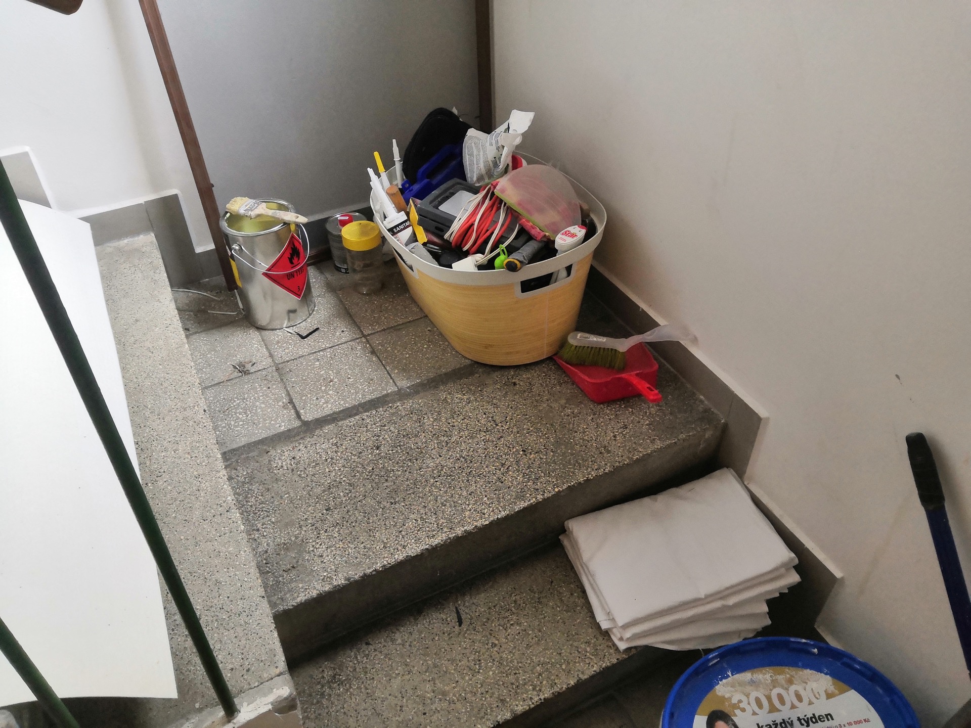 očištění schodiště, zaříznutí nového pvc včetně samotného nalepení. Dále nelepeny i schodové hrany na pvc. Zaříznutí latí na krytí prostoru okolo sádrokartonu. Vyplnění prostoru a vytmelení. Obroušení a natření zábradlí. Obroušení a nalakování madel zábradlí.